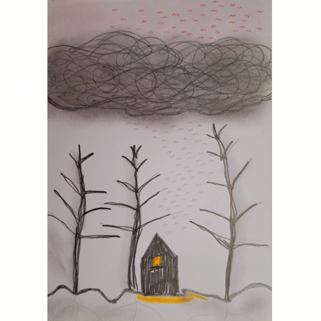Grijs krijgt kleur vandaag! Vorige week vrijdag leek het grijs de hele wereld ‘op te slokken’. Het helpt me dan om het op papier te zetten. Zeker niet mijn mooiste potloodschets maar wel onverbloemd eerlijk. Samen met het gedicht ‘de hemel vol vogels’ heb ik deze tekening ook gepost op Instagram. Maar dit grijze duo krijgt een verrassend vervolg!