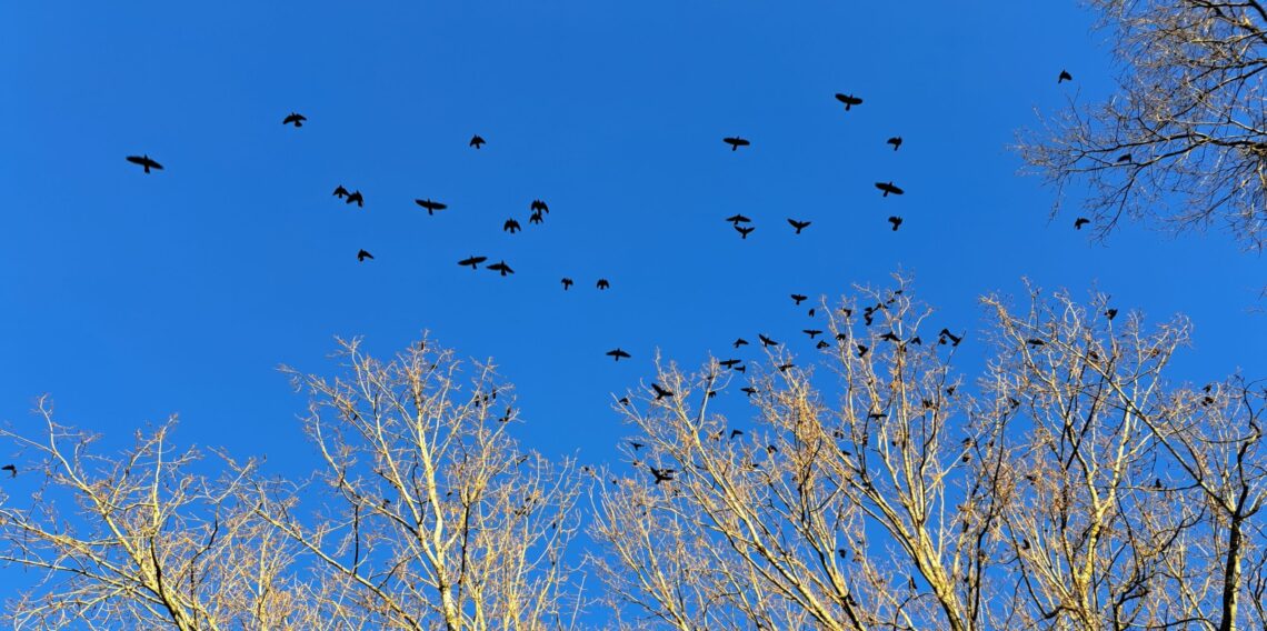 Tot mijn verrassing kreeg deze tekening gisteren tijdens een wandeling een vervolg. Zo nu en dan schiet ik een foto onderweg, zodat ik achteraf nog eens kan verwonderen.. Ik ben vroeg wakker deze ochtend en scrol door de galerij in mijn Smartphone. De enige foto’s die ik gisteren heb genomen zijn van een grote groep kauwen. Vogels tegen hemelsblauw. In de takken van de hoge Populieren. Ineens treft me de parallel met mijn tekening. Het is als een antwoord, zo bijzonder! Misschien ook voor jou deze reminder; ‘grijze seizoenen gaan weer voorbij, er komt iets nieuws. Echt waar!’