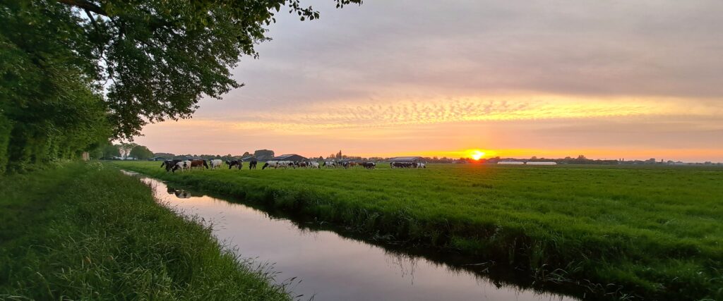 Het volkstuincomplex ligt aan de rand van de polder, afgelopen week graasden de koeien aan de andere kant van de sloot. De boer zet regelmatig een nieuw stuk af zodat er steeds jong lente gras beschikbaar is voor de dames. Ben je wel eens gaan zitten zo aan de rand van een weiland, dicht bij een grazend koppel koeien? Ik doe dat elke zomerperiode meerdere malen, gewoon omdat het kan. Afhankelijk van hun plaats in de kudde kijken ze me angstig nieuwsgierig of brutaal nieuwsgierig aan.. Zo van ’wie ben jij’ of ‘wat moet jij?’ Na een korte onderzoekende blik blijkt dat deze koeien duidelijk gewend zijn aan mensen. Onverstoorbaar klinken de ruwe tongen langs het malse lente gras. Even verderop word gretig gedronken uit de poldersloot.