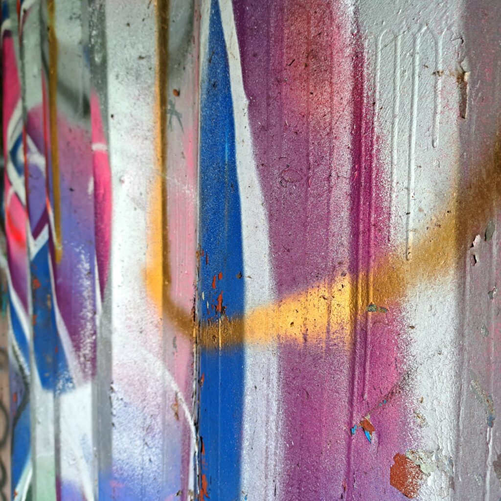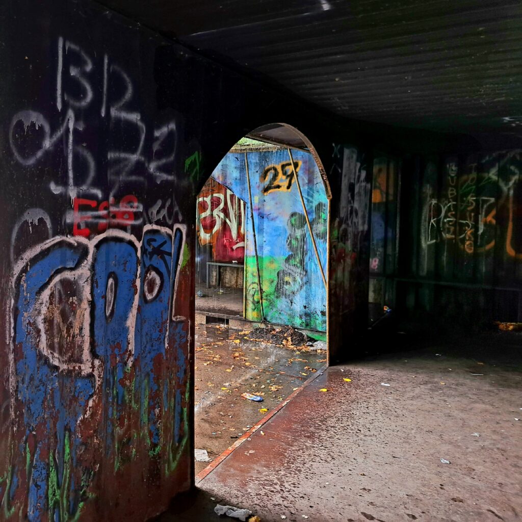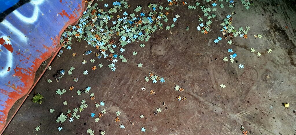 Verlicht en dankbaar wandel ik verder. Ik passeer een jongerenkeet en besluit even naar binnen te gaan om wat foto’s te nemen. Want fotogeniek is het hier wel, de kleurige graffiti springt me tegemoet. Iemand heeft een legpuzzel omgekeerd op de vloer. Een chaos aan puzzelstukjes.