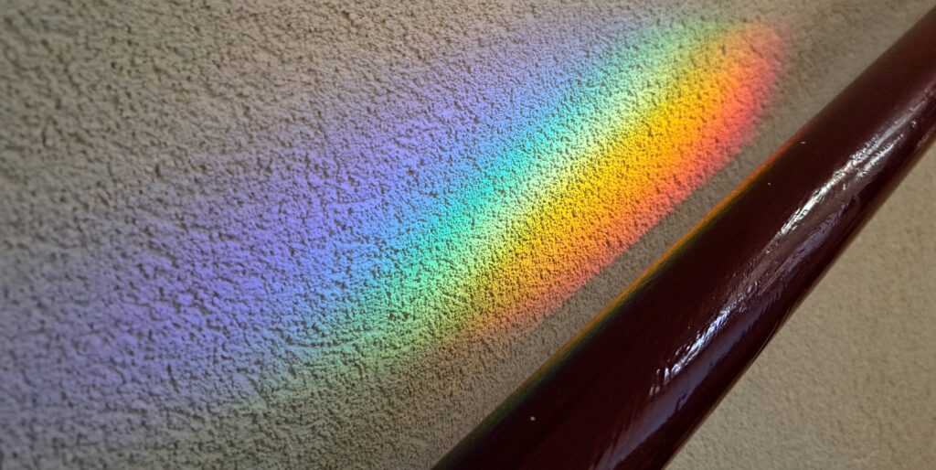 Regenboog. Het is een verdriet dat blijft, te midden van een schatkamer aan hemelse zegeningen. Dan zijn daar zomaar ineens de tranen. Het is lang geleden dat ik hier om gehuild heb. Met de jaren is het verdriet veranderd maar toch is het zo dat een gedeelte nooit echt slijt. Op een dag zal de menopauze komen voor mij, op een dag zullen -als de HEERE het wil en wij leven- mijn zussen oma mogen worden. Het is verdriet dat meegroeit over tijd. En toch, de Vader verrast mij zomaar op de trap naar beneden. Hier strijkt het Licht van de ‘Ik Ben’ over mijn hand. Een prisma omdat de zon op de badkamerspiegel schijnt. Maar voor mij is het een; ‘Ik zal er zijn’. Voldoende voor vandaag!