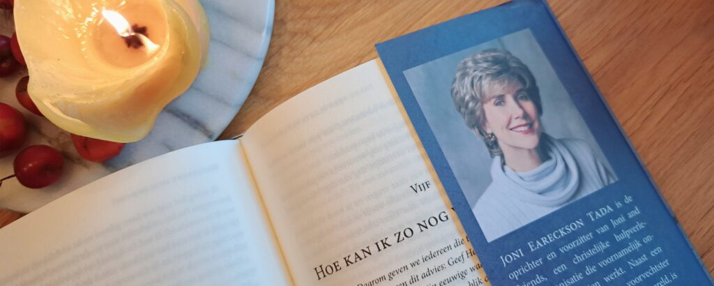 Twee nachten later sta ik weer voor de boekenkast, op zoek naar een nieuw boek. Mijn lijf en hart zijn moe geworden, ik hoop op wat bemoediging en pak ‘Een plaats van genezing’ door Joni Eareckson Tada uit de kast. De onder titel zegt al heel veel; ‘Worstelen met het mysterie van lijden, pijn en Gods almacht.’ Joni had een ongeluk in haar tienerjaren waardoor ze vanaf haar nek verlamd geworden is. Ik sla het open waar de boekenlegger ligt. Prompt springt mij de titel, de vraag van hoofdstuk 5 tegemoet.